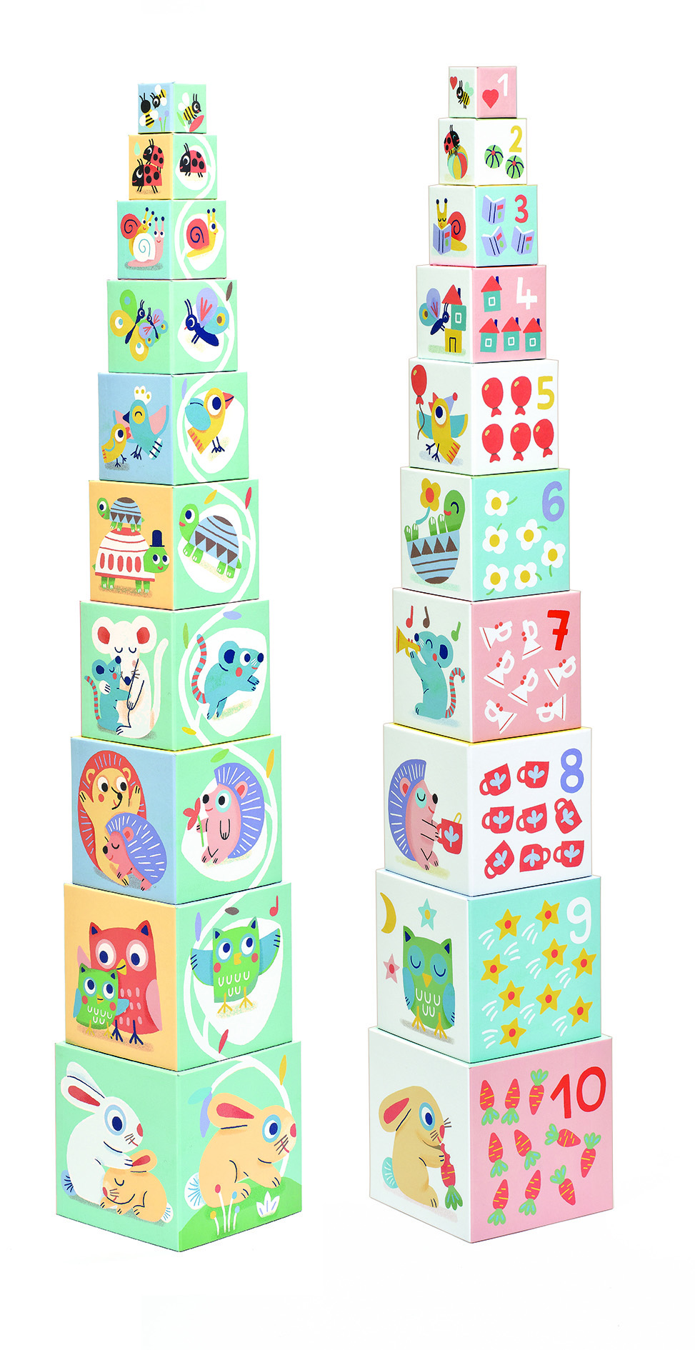 Juego apilable de cartón, El cual se ordenará por tamaños en el qué podrán descubrir animales, figuras, números y cantidades. Contiene: 10 cubos / altura 86 cm.