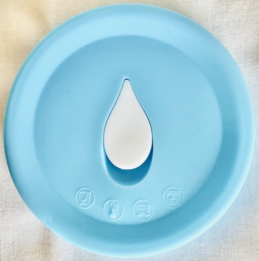 -Tapa de silicona celeste antiderrames con respirador, lleva instrucciones de cuidado del producto en conjunto impreso.