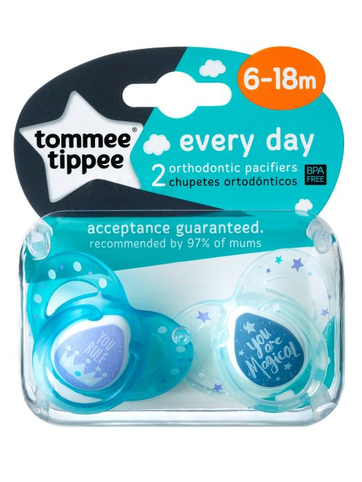 El chupón Every Day de Tommee Tippee tiene un diseño anatómico con forma simétrica que mejora el equilibrio, haciendo que sea más sencillo para los bebés sujetarlo con la boca, además ayuda al desarrollo natural bucal. Tiene la misma forma que una tetina, por lo cual al bebé le resultará familiar. Material: silicona, libre de BPA. Para bebés de 6-18M. Contiene 2 unidades.