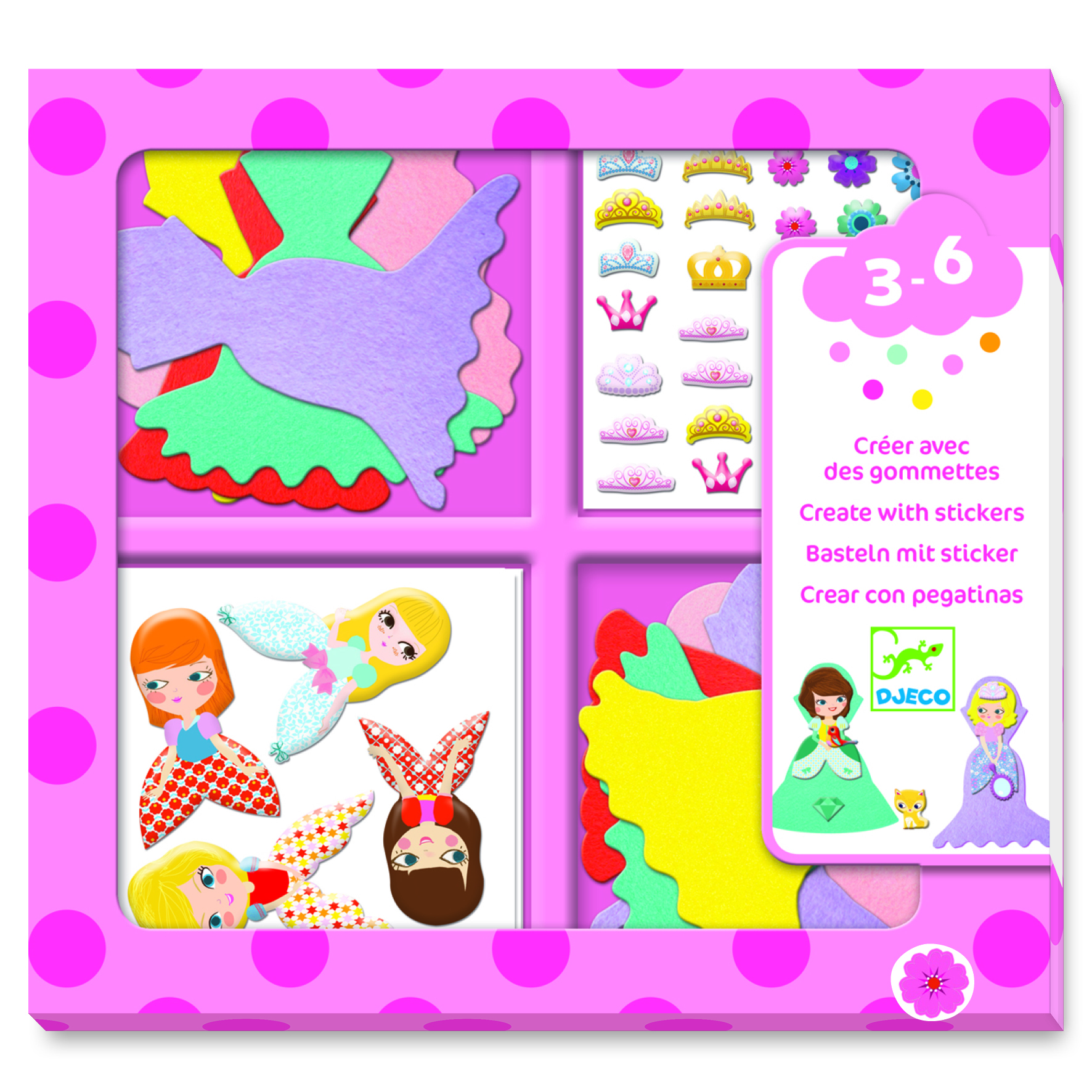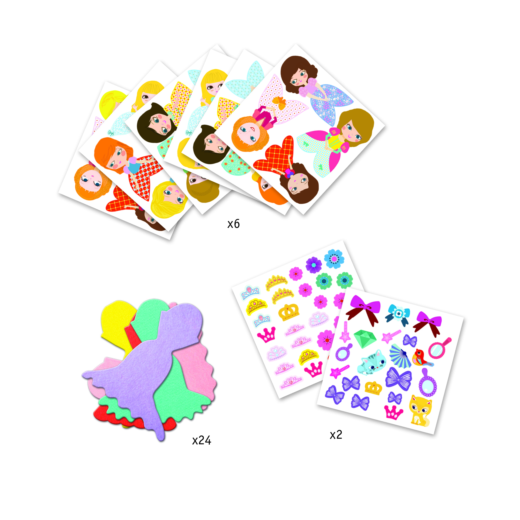 Juego de pegatinas para personalizar tú princesas, Ideal para experimentar patrones y texturas. Contiene: 6 hojas de pegatinas, 24 siluetas fieltro y 2 hojas de accesorios.