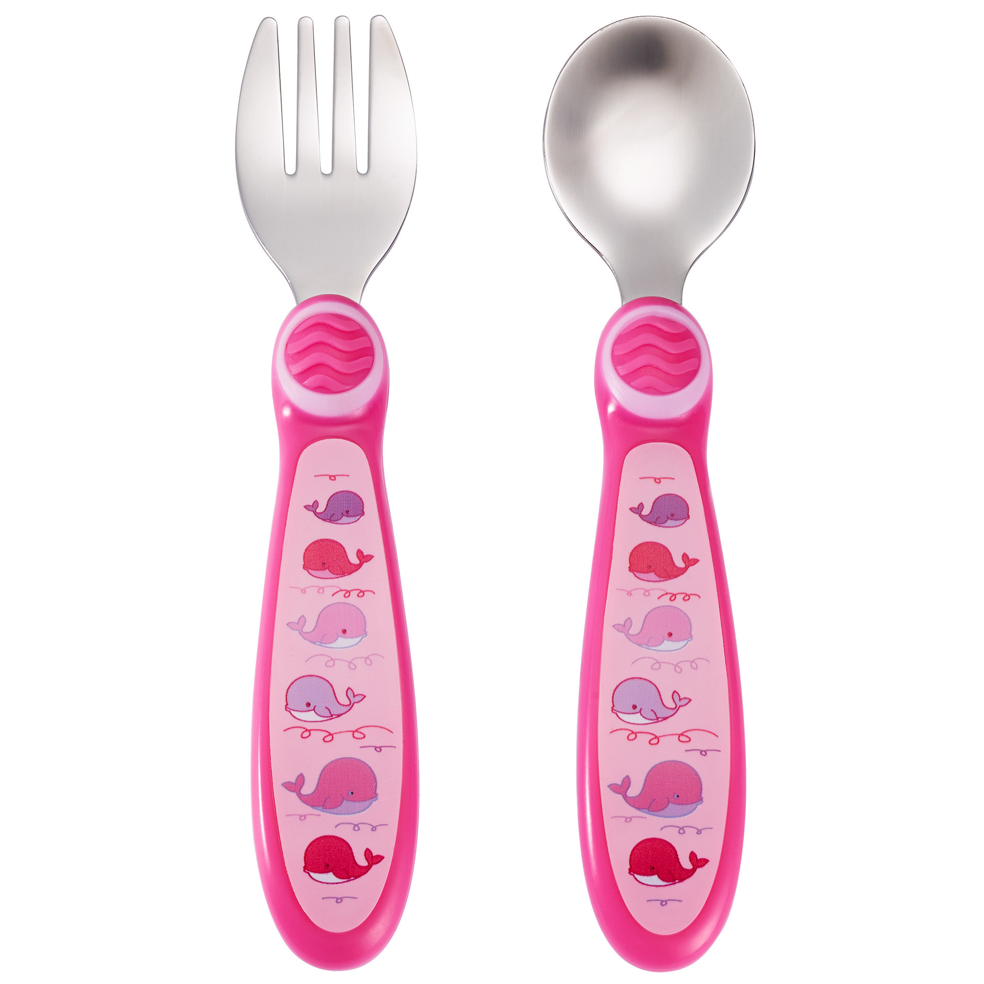 Set de cuchara y tenedor de acero inoxidable con mangos de plástico. Cuentan con un diseño de fácil agarre que es perfecto para las manos pequeñas.