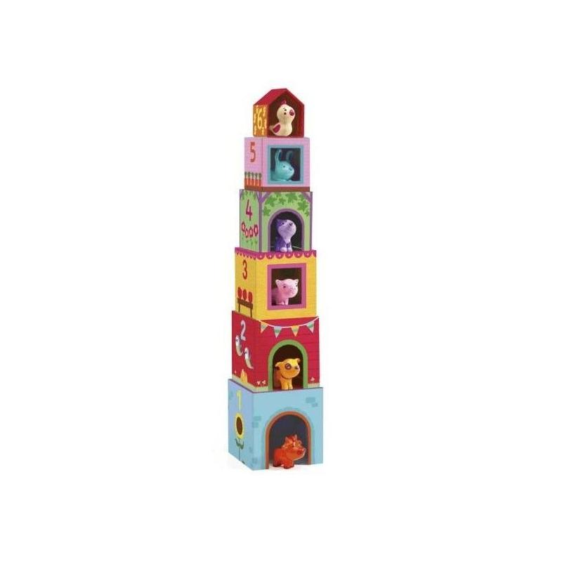 Juego apilable de cartón, El cuál se ordenará por tamaños por, En el qué podrán descubrir animales, Número y colores. Contiene: 6 cubos para apilar y 6 animales de plástico.