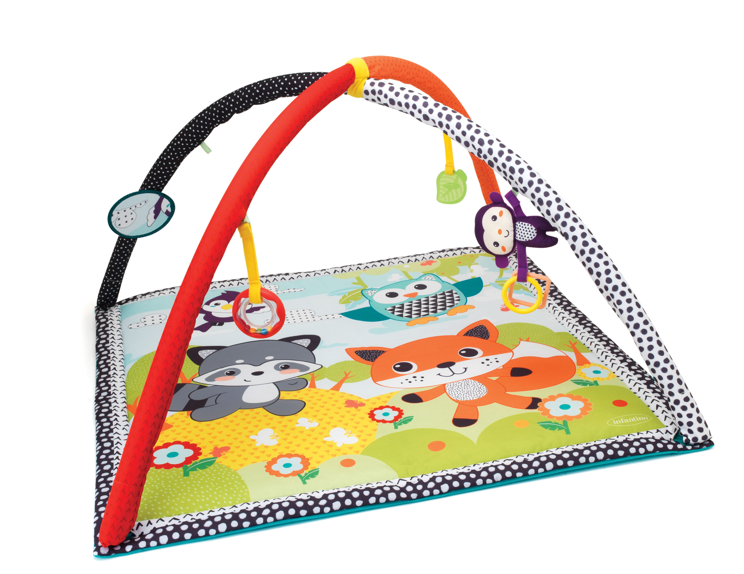 El gimnasio y mat de actividades está repleto de fantásticas funciones, entre las que se incluye un espejo, tapete de juegos de colores brillantes y cuatro juguetes colgantes. ¡Es el complemento perfecto para grandes aventuras o para convertir pequeños espacios en una gran diversión!