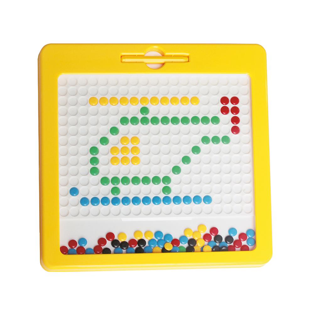 Pizarra magnetica que contiene tarjetas con patrones y un lápiz magnético que se ubica sobre la cubierta de plástico transparente, se selecciona la ficha que se quiere mover y se desliza para crear tus propios diseños o los patrones propuestos en las tarjetas.