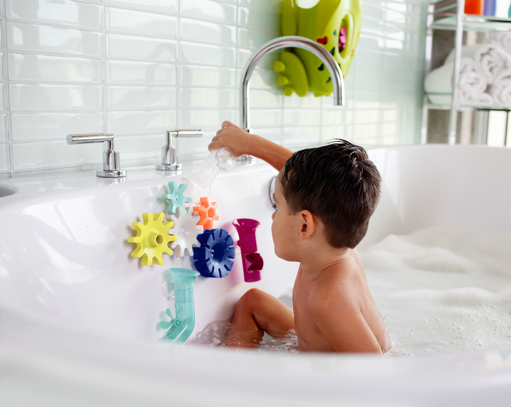 Engranaje + agua = diversión a la hora del baño! Las tuercas se pegan a las paredes del baño y dan vuelta cuando se vierte agua sobre ellas.