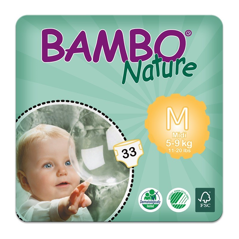 Bambo Nature Midi es un pañal premium para niños de 5-9 kg. Los pañales están hechos con materiales 100% sustentables que representan la nueva generación de pañales ecológicos. Gracias a nuestra lámina posterior y superior de tipo textil, el pañal se siente extra suave al contacto con la piel del bebé.