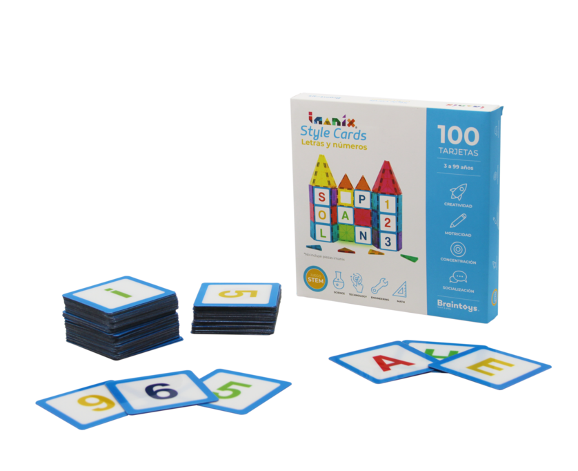 | Set de tarjetas imantadas con letras y números, compatibles con Imanix, que se adhieren a cada pieza gracias a la fuerza de los imanes. Contiene todas las letras del abecedario, para trabajar consonantes, vocales, reconocer formas, asociar con sonidos iniciales, formación de palabras, apuntando al desarrollo del lenguaje. Además incluye dígitos del 0 al 9, para la formación de números y cantidades. |