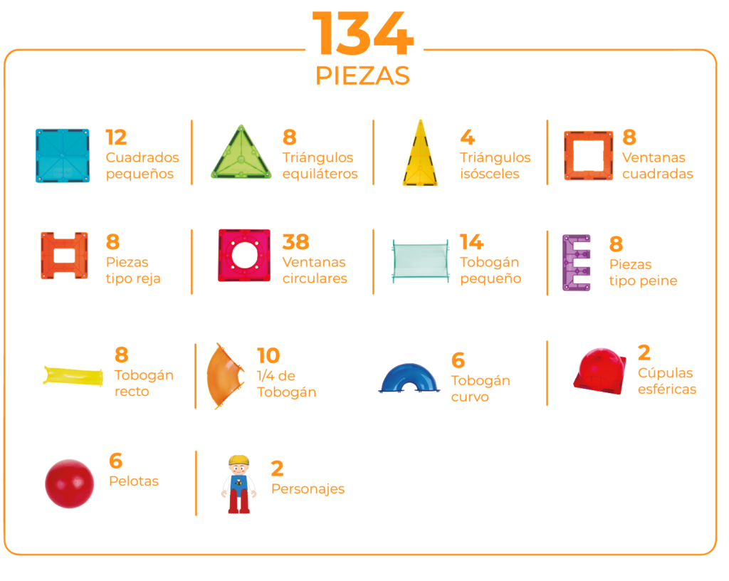 Incluye: 12 cuadrados pequeños, 8 triangulos equilateros, 4 triangulos isosceles, 8 ventanas cuadradas, 8 piezas tipo rejas,  38 ventanas circulares, 14 toboganes pequeños, 8 piezas tipo peine, 8 toboganes rectos, 10 1/4 tobogan, 6 toboganes curvos, 2 cupulas esfericas, 6 pelotas, 2 personajes.